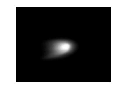 Once the condensate is made, we gradually ramp down the main confinement fields and ramp on the waveguide fields. Sequential images of the condensate during this process are shown below. The images are taken from above the chamber, so that the y direction (long axis of images) is along the axis of the waveguide. The condensate is observed to change location, and also lengthens along the waveguide axis. We initially believed that the position change occurred because the center of the waveguide was not precisely aligned with the center of the inital atom trap, but further investigation has suggested that this may be part of an oscillatory process.